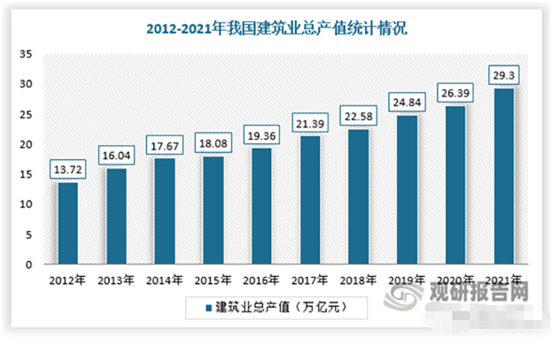 根據(jù)觀研報告網(wǎng)發(fā)布的《中國塑料異型材行業(yè)現(xiàn)狀深度調(diào)研與發(fā)展前景分析報告(2023-2030年)》顯示,在建筑領(lǐng)域,建筑作為國民經(jīng)濟支柱產(chǎn)業(yè),占國內(nèi)生產(chǎn)總值的比例始終保持在6.5%以上,截止2021年全年全國實現(xiàn)建筑業(yè)增加值8萬億元,占國內(nèi)生產(chǎn)總值的7%。同時,建筑業(yè)總產(chǎn)值呈逐年增長態(tài)勢,截止2021年底中國建筑業(yè)總產(chǎn)值達到29.3萬億元,2013-2021年年均增長8.8%。由此可見,我國塑料異型材行業(yè)需求或?qū)⒊掷m(xù)保持上升。